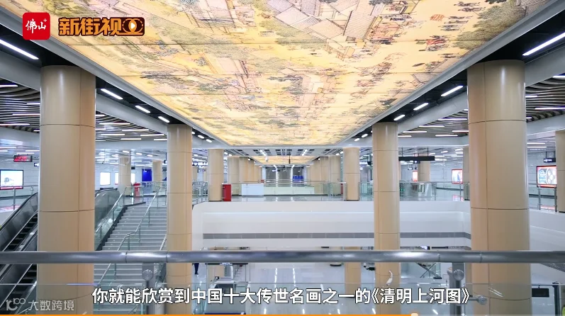 东平站中庭空间,提取城市绿洲荷花及水波纹元素,中庭天花以大幅透光软膜图案呈现,一抬头就能欣赏到中国十大传世名画之一的《清明上河图》。