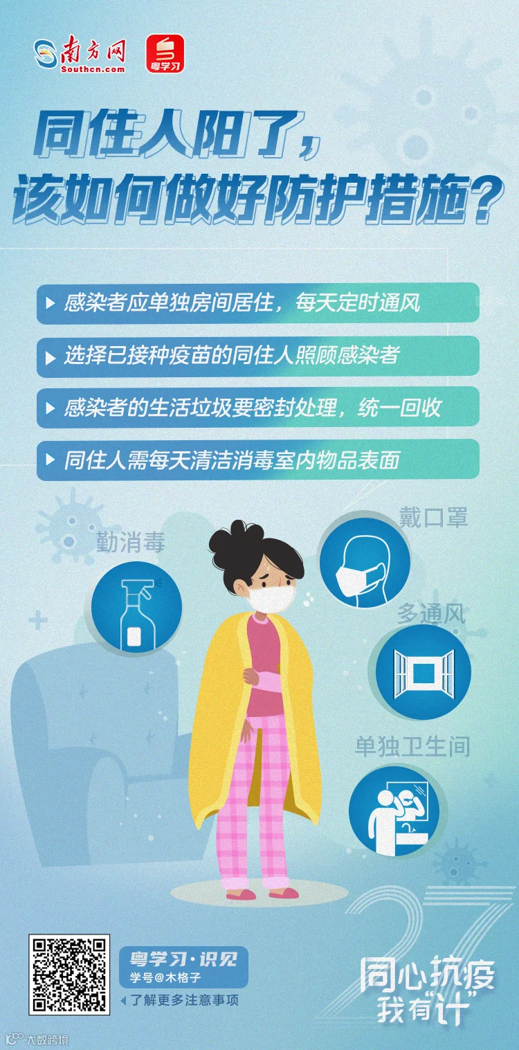 尽可能确定相对固定的1名同住人作为陪护家属进行照顾。陪护家属首选身体健康且完成全程疫苗接种及加强剂的人员,在接触感染者时要佩戴N95口罩和一次性医用手套,接触后将口罩和手套扔掉,并做好全身消毒。其他成员避免和阳性者正面接触。