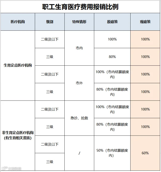 一是参保职工在市内、外三级生育定点医疗机构及因急诊抢救在非生育定点医疗机构(有生育相关资质)发生的符合规定的生育医疗费用,报销比例提高至100%;