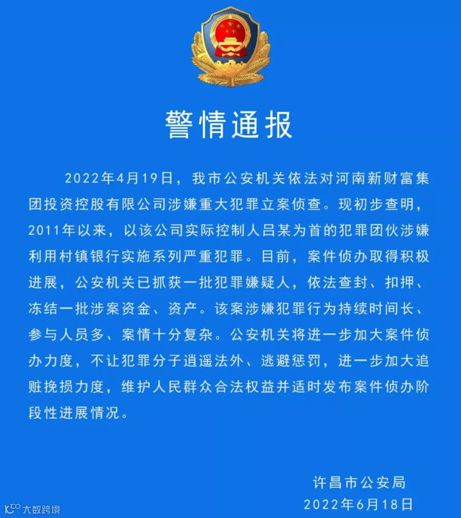 2022年4月19日,许昌市公安机关依法对河南新财富集团投资控股有限公司涉嫌重大犯罪立案侦查。现初步查明,2011年以来,以该公司实际控制人吕某为首的犯罪团伙涉嫌利用村镇银行实施系列严重犯罪。目前,案件侦办取得积极进展,公安机关已抓获一批犯罪嫌疑人,依法查封、扣押、冻结一批涉案资金、资产。