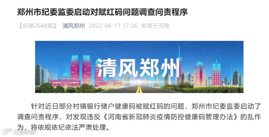 6月17日,郑州市纪委监委发布消息:针对近日部分村镇银行储户健康码被赋红码的问题,郑州市纪委监委启动了调查问责程序,对发现违反《河南省新冠肺炎疫情防控健康码管理办法》的乱作为,将依规依纪依法严肃处理。