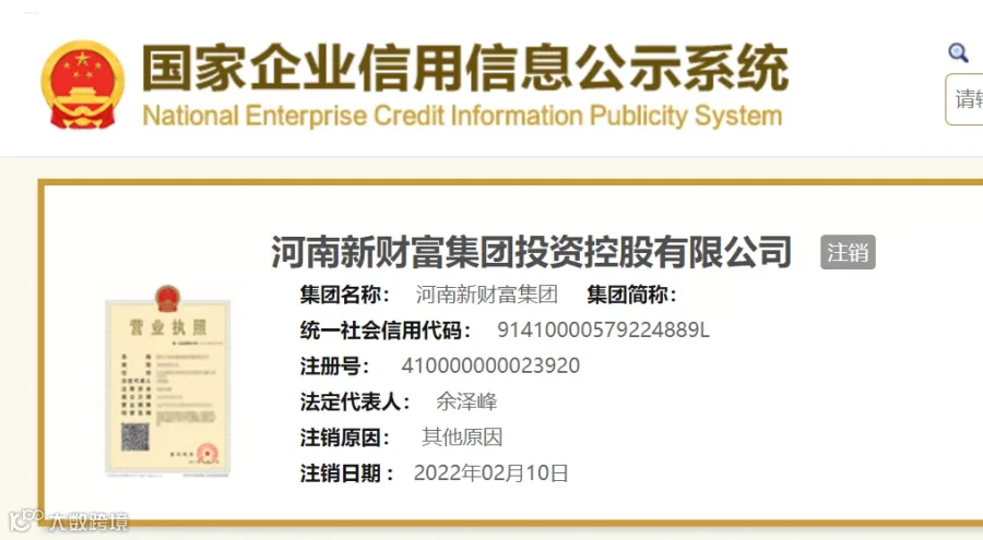 公开资料显示,河南新财富集团投资控股有限公司成立于2011年7月,注册资本1.6亿元。2022年2月,该公司已注销。
