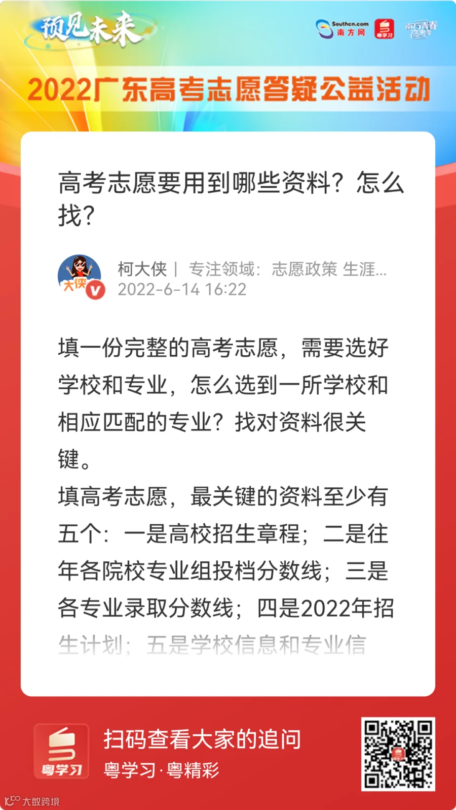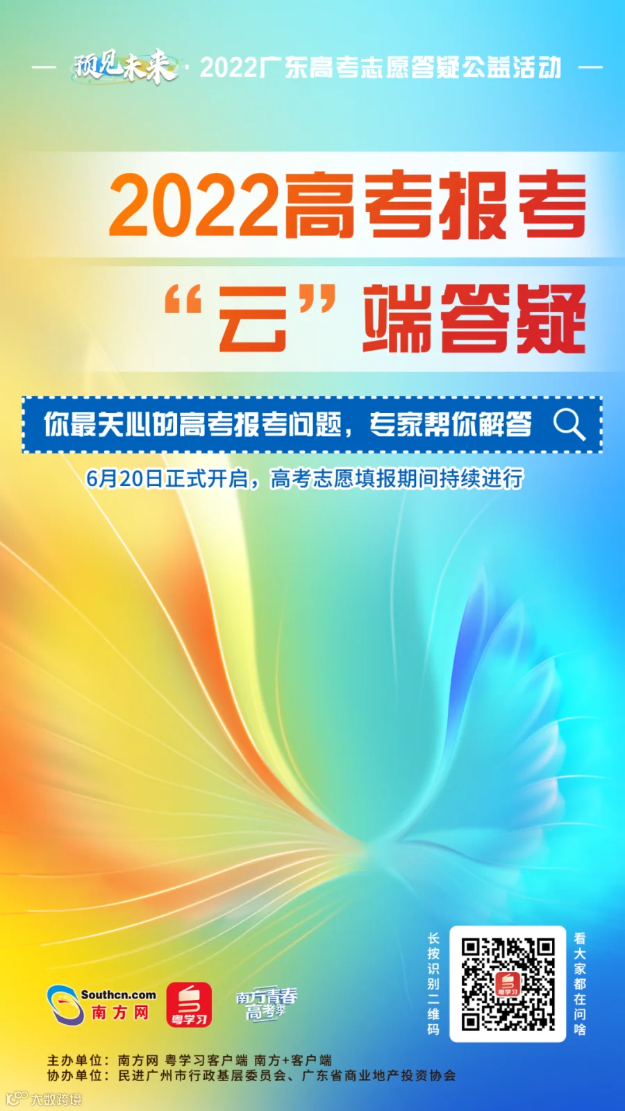 为了帮助大家做好志愿填报这个重要决策,6月20日起,至高考志愿填报结束,由南方网主办的“预见未来·2022年广东高考招生线上咨询周”,将在粤学习客户端“广东阳光招考掌上平台”举办,面向全网高考生和家长免费解答各类志愿报考问题。