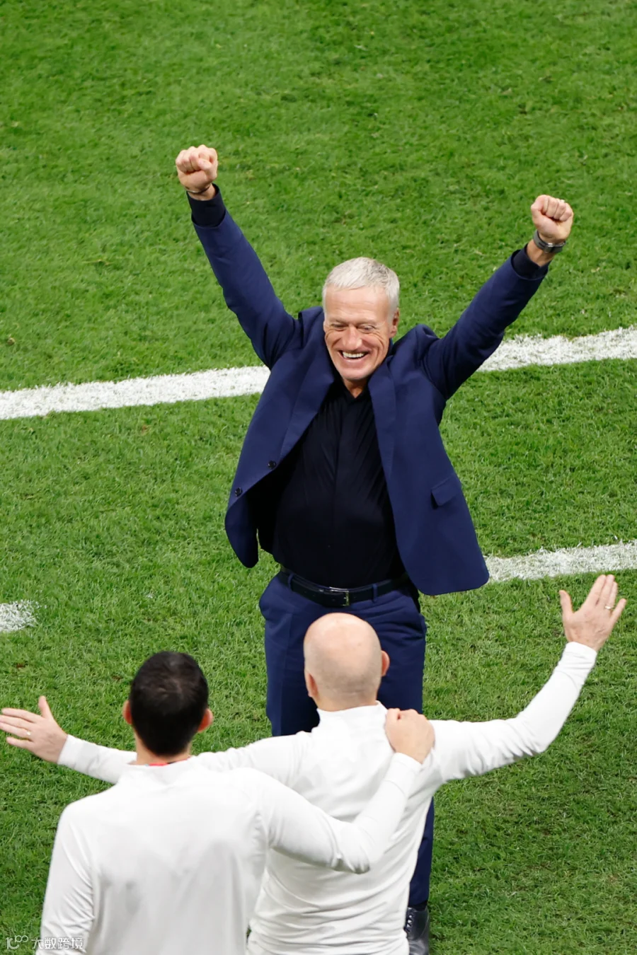 12月14日,法国队主教练德尚(上)在比赛后与教练组成员庆祝胜利。新华社记者王丽莉摄