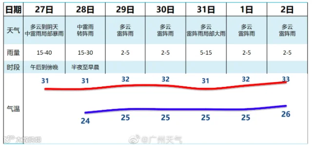 预计,27日-28日广州市有中雷雨局部暴雨,强降水主要集中在27日午后至上半夜以及28日凌晨至早晨。强降水中心可能出现在从化、增城、花都的山区,面上累计雨量20-40毫米,局部60-80毫米,最大小时雨强40-60毫米,部分地区可能伴有6-7级短时大风和雷电。29日起雷雨有所减弱。