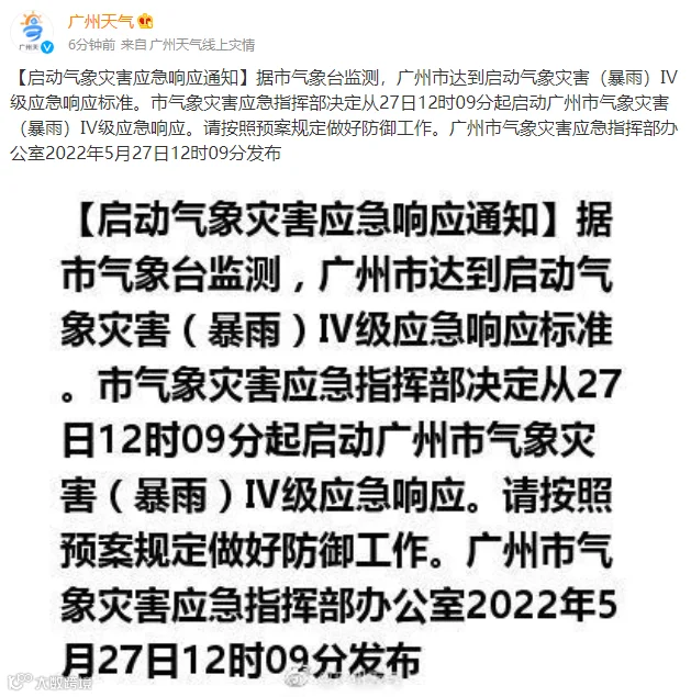 【启动气象灾害应急响应通知】据市气象台监测,广州市达到启动气象灾害(暴雨)Ⅳ级应急响应标准。市气象灾害应急指挥部决定从27日12时09分起启动广州市气象灾害(暴雨)Ⅳ级应急响应。请按照预案规定做好防御工作。广州市气象灾害应急指挥部办公室2022年5月27日12时09分发布。