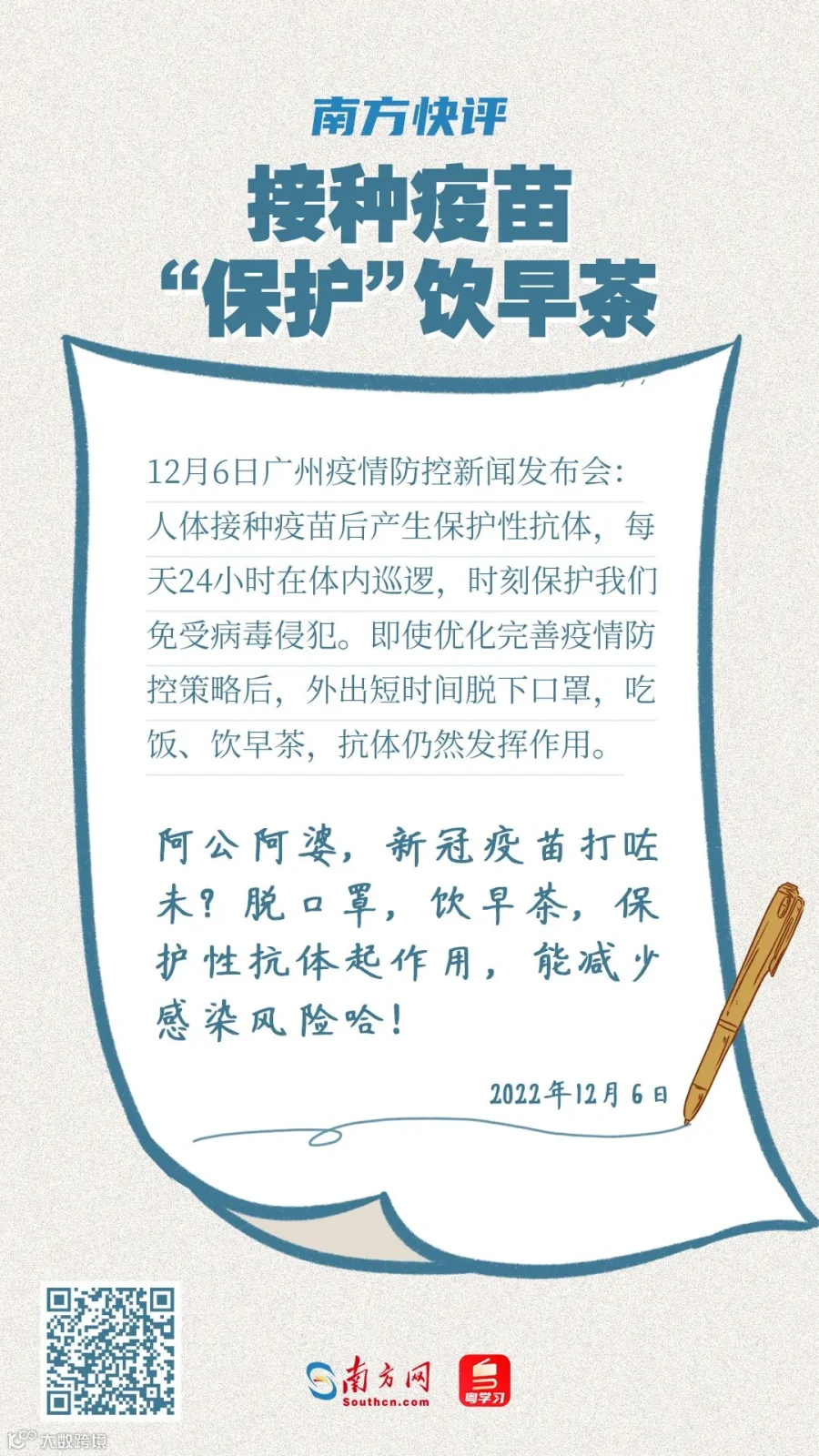 广州市疾病预防控制中心原主任、流行病学主任医师王鸣介绍,广州市近来采取的优化完善疫情防控策略,是适应疫情防控形势的新形势和新冠病毒变异的新特点,进一步提升防控的科学性、精准性。这是由于全市人群经过努力,加强新冠疫苗免疫接种达到92%以上的高覆盖率,限制了病毒的传播及症状的发生,从而为疫情防控打下了良好的基础。这证明,接种新冠疫苗,是最有效的防疫措施。人体接种疫苗后产生的保护性抗体可以每天24小时在我们身体内巡逻,时刻保护我们免受病毒的侵犯。即使优化完善疫情防控策略后人们外出短时间脱下口罩,吃饭、饮早茶,抗体仍然发挥着作用。