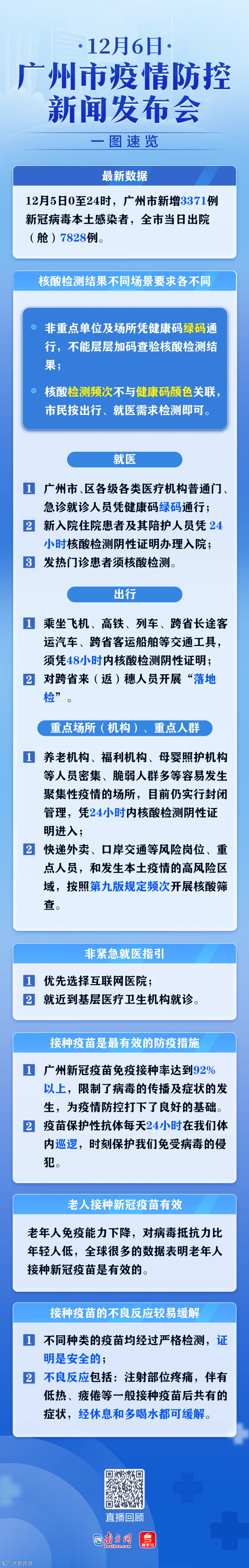 12月6日,在广州市疫情防控新闻发布会上,广州市卫健委副主任、新闻发言人张屹介绍,12月5日0至24时,广州市新增3371例新冠病毒本土感染者。新增感染者中无症状2262例、轻型和普通型1109例,无重型、危重型患者。12月5日,全市当日出院(舱)7828例,本轮疫情累计出院(舱)94834例。我市当前疫情依然多点、多面、多链,呈现局部聚集与点状散发并存状态。