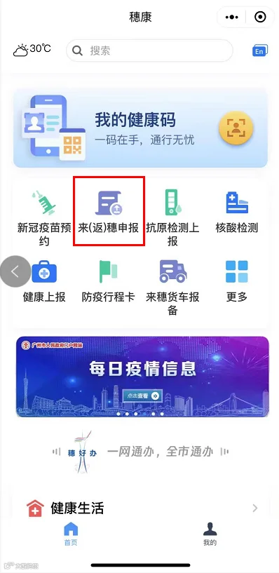 目前,“穗康”小程序已上线开通“来(返)穗申报”入口,外省来(返)穗人员可通过此入口提前报备。
