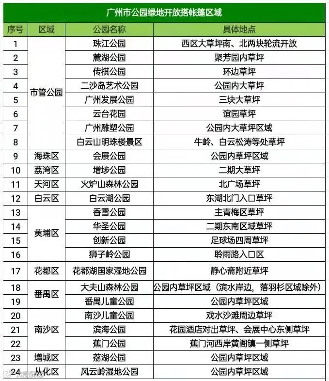 为完善公园服务功能,同时让市民享受足不出户的美好休憩体验,今年新年开始,广州就推出了第一批24个绿地草坪帐篷区,在符合条件的公园内划定专门区域供市民游客搭设帐篷。