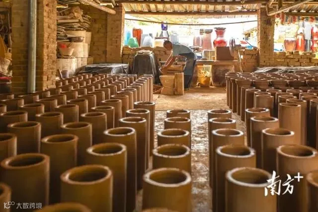 5月18日,阳江市阳春扶堤古窑,工棚里阳光明媚,工人正在制作烟囱。刘正亮 摄