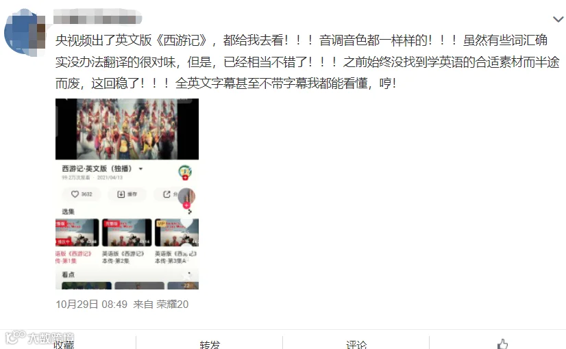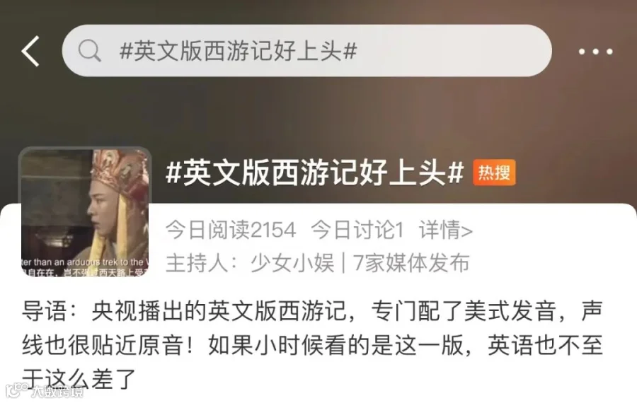 当然,由于这部英文版《西游记》是面向大众的、娱乐性质较强的电视剧,部分翻译有人指出并不准确,配音的英文发音也不尽标准,但如果真能被经典电视剧激发兴趣,长期听“英语听力”、读英文字幕,也一定会在娱乐的同时,对学习英文有所帮助。