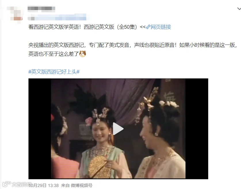 电视剧《西游记》(Journey to the West)于1986年在央视首播,堪称史上重播次数最多、最家喻户晓的国产电视剧之一。最近,此前曾在央视频上线的《西游记》英文版片段在视频平台走红,剧中的名场面和经典台词用英语呈现,且配音演员的声线非常贴近原版,许多网友看完直呼“太神奇了”。