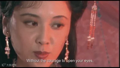女儿国国王向唐僧示爱时,问道:“不敢睁眼看我,还说什么四大皆空呢?”(Without the courage to open your eyes, have you achieved emptiness?)