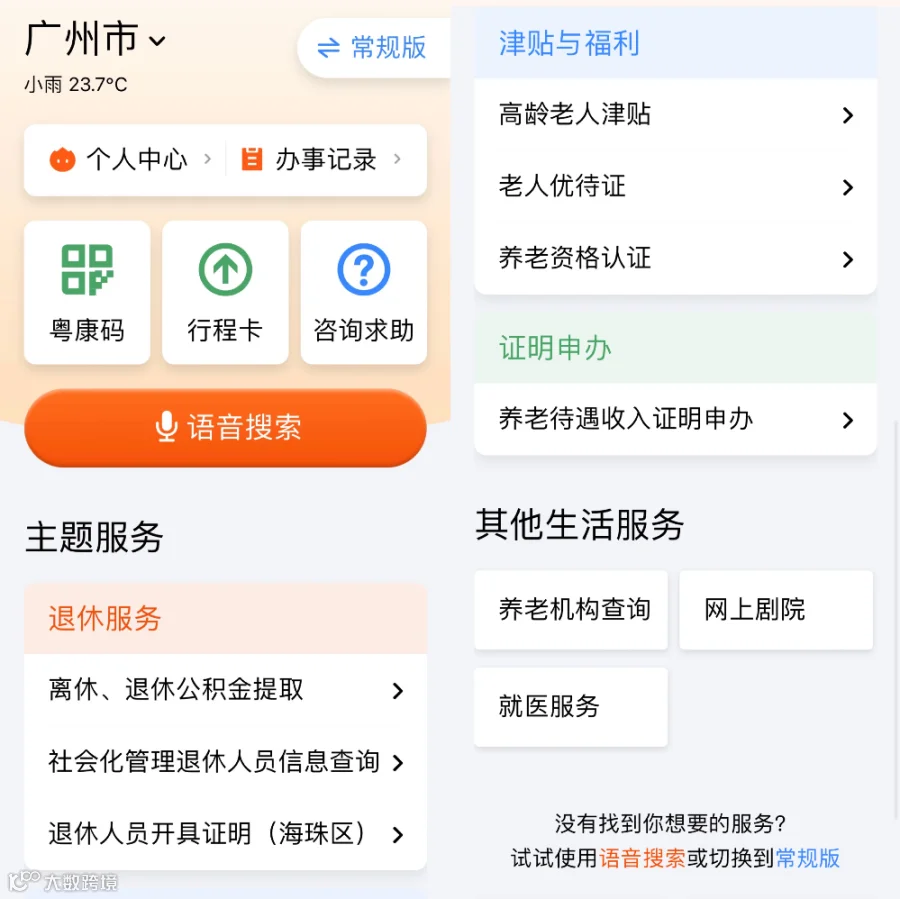 2021年,粤省事平台率先推出“尊老爱老服务专区”,为全国首个政务类的适老化专区。此次,粤省事APP进一步升级优化,并打造出全方位的“老人关怀版”。该版块采用大号字体,支持语音搜索,并提供养老服务、粤康码和行程卡等方便老人生活的高频服务,让老年人线上办事更简单、高效。