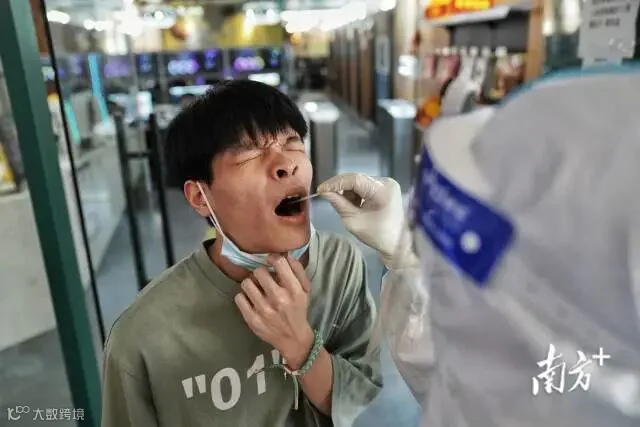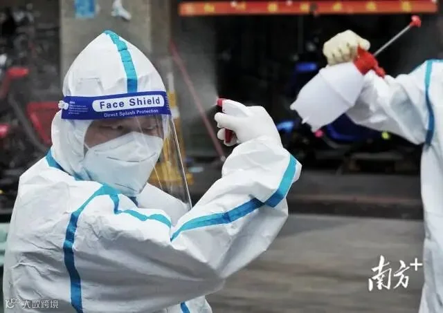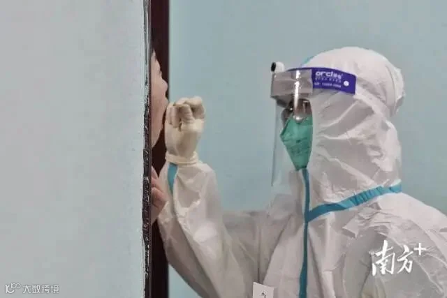 中午12时,骄阳似火,测核酸的医疗队伍来了。刚“跑楼”送完物资的梁伟泉,扒上几口盒饭,便快速换上二级防护服,开启一天中的“扫楼”之旅。