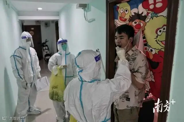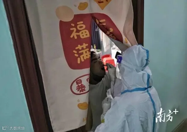 4月12日,封控第4天,白云区妇幼保健医院6名医护人员前来支援核酸检测,分成3组例行上门为封控区里的居民采集核酸。