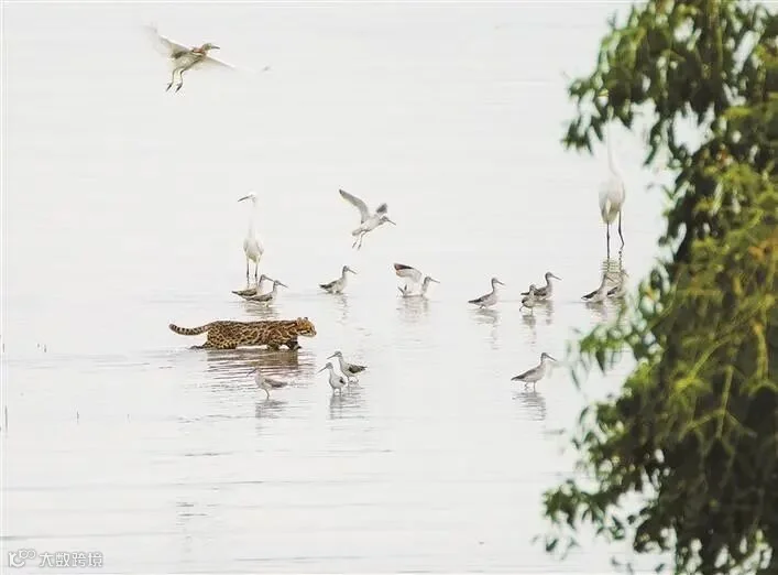 意外拍摄到一只从候鸟群中涉水而过的豹猫