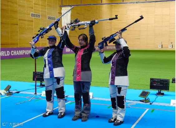 在女子50米步枪三姿团体(青年组)比赛中,庞钰千和队友携手夺冠。