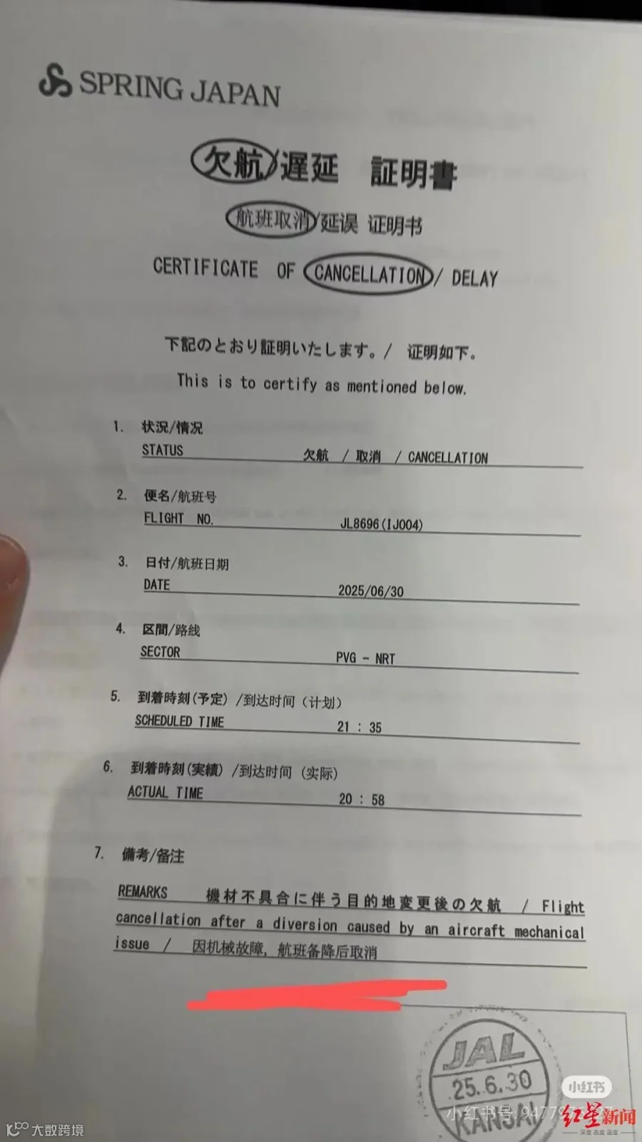 据红星新闻报道,记者获得了部分游客发布的航班延误证明书,上面显示航班JL8696(IJ004)因机械故障航班延误后取消。