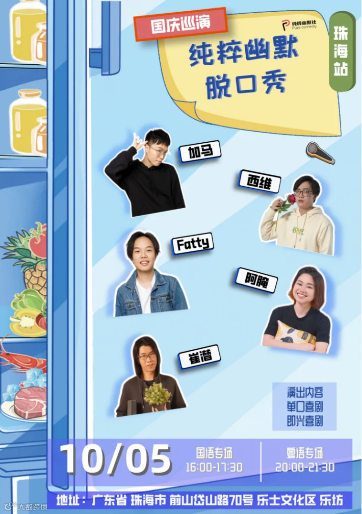 国庆假期,纯粹幽默社巡演来到珠海,单口喜剧和即兴喜剧将给珠海市民朋友带来喜剧文化大餐。此次演出包括国语和粤语两个专场,《脱口秀大会》第一季卡司、《吐槽大会》编剧加马,粤语文化使用大使西维等演员将登台演出。