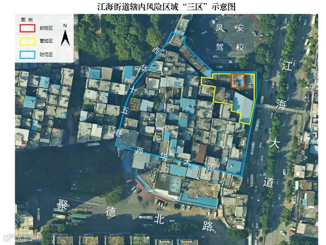 三、防范区:南洲街全域;江海街新村西安大街31号至西华大街11号、20号,西华大街14巷1号至西安大街44号、西华15巷12号。实行“强化社会面管控、严格限制人员聚集”管理措施。