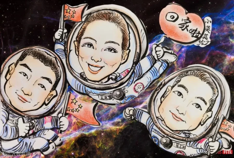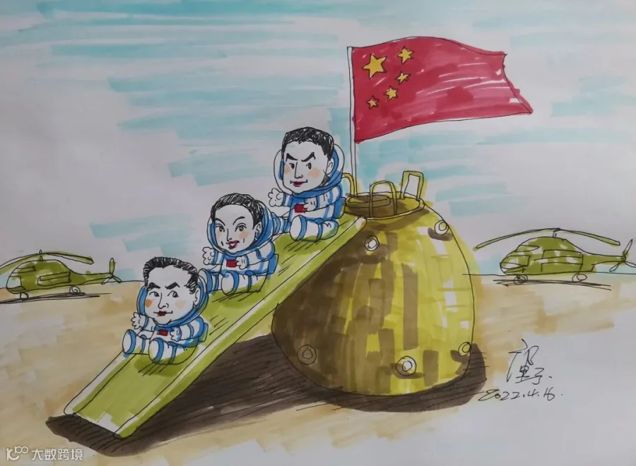 Cartoonists Xiao Yingying (@小英英) and Chang'an Muye (@长安沐夜) respectively drew cute portraits of the three taikonauts in the scene of a happy returning to Earth.