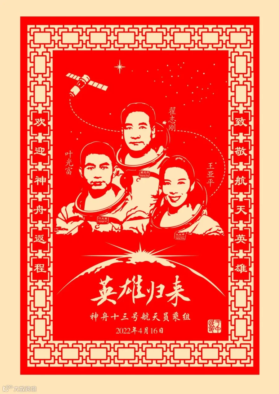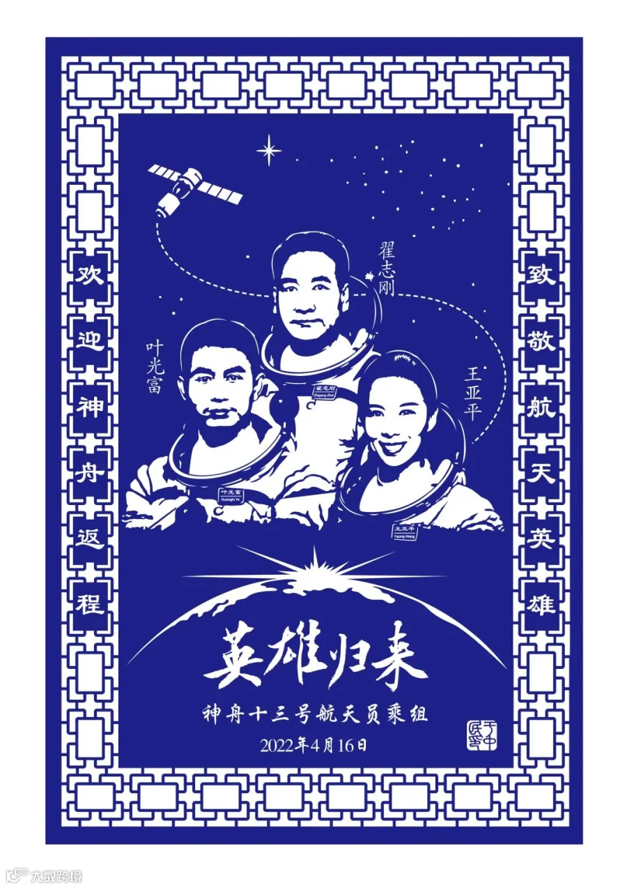 广州剪纸协会会长于中民创作了一套以3位航天员为主体人物的剪纸作品《英雄归来》,表达对航天英雄的崇高敬意。作品以浩瀚的太空为背景,用神舟十三号载人飞船的运行轨迹连接天地,中间是栩栩如生的航天员肖像。作品使用浓郁的中国红和酷炫的太空蓝两种颜色,配以中国风边框设计,左右对称,整幅画面接近黄金比例。