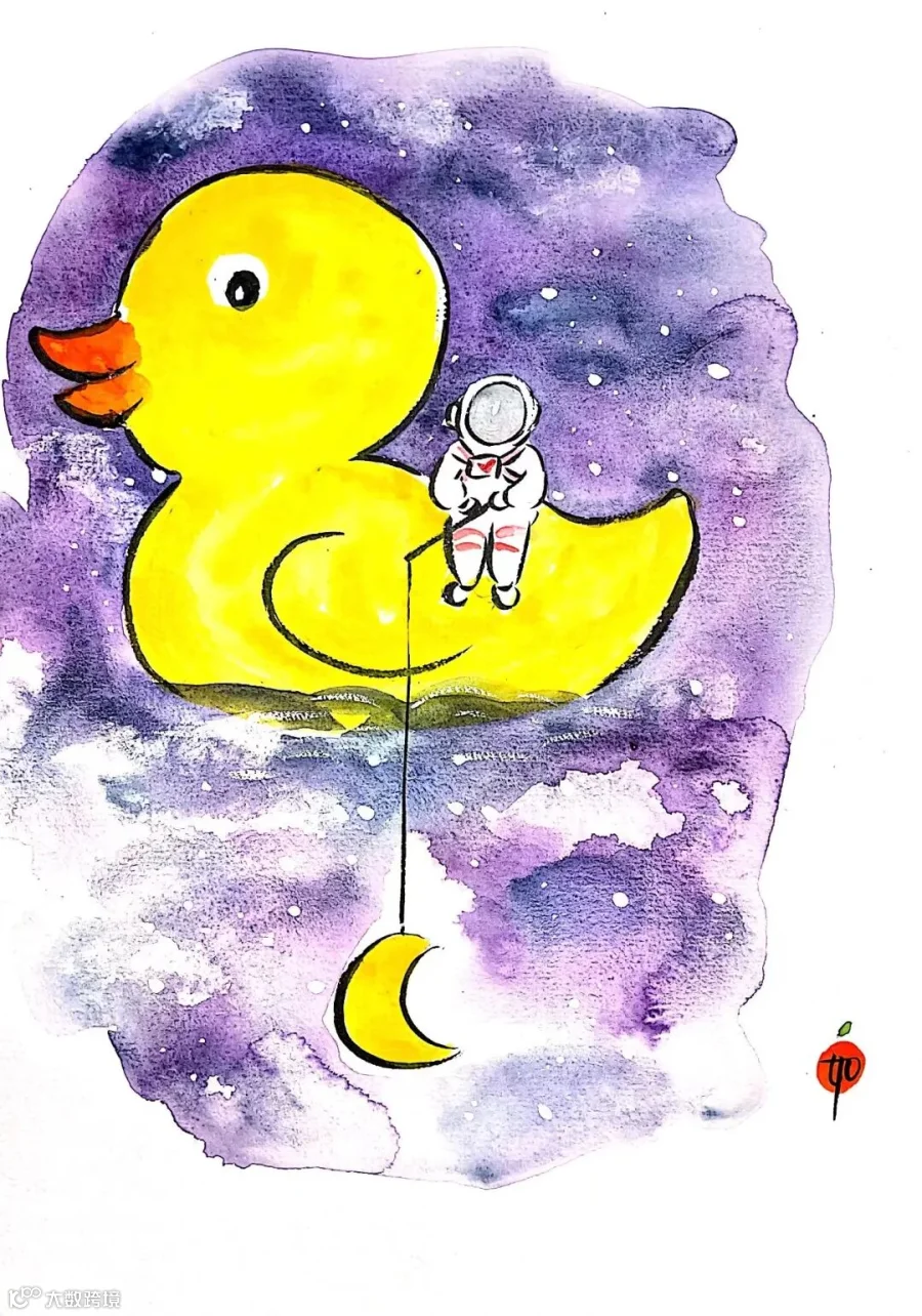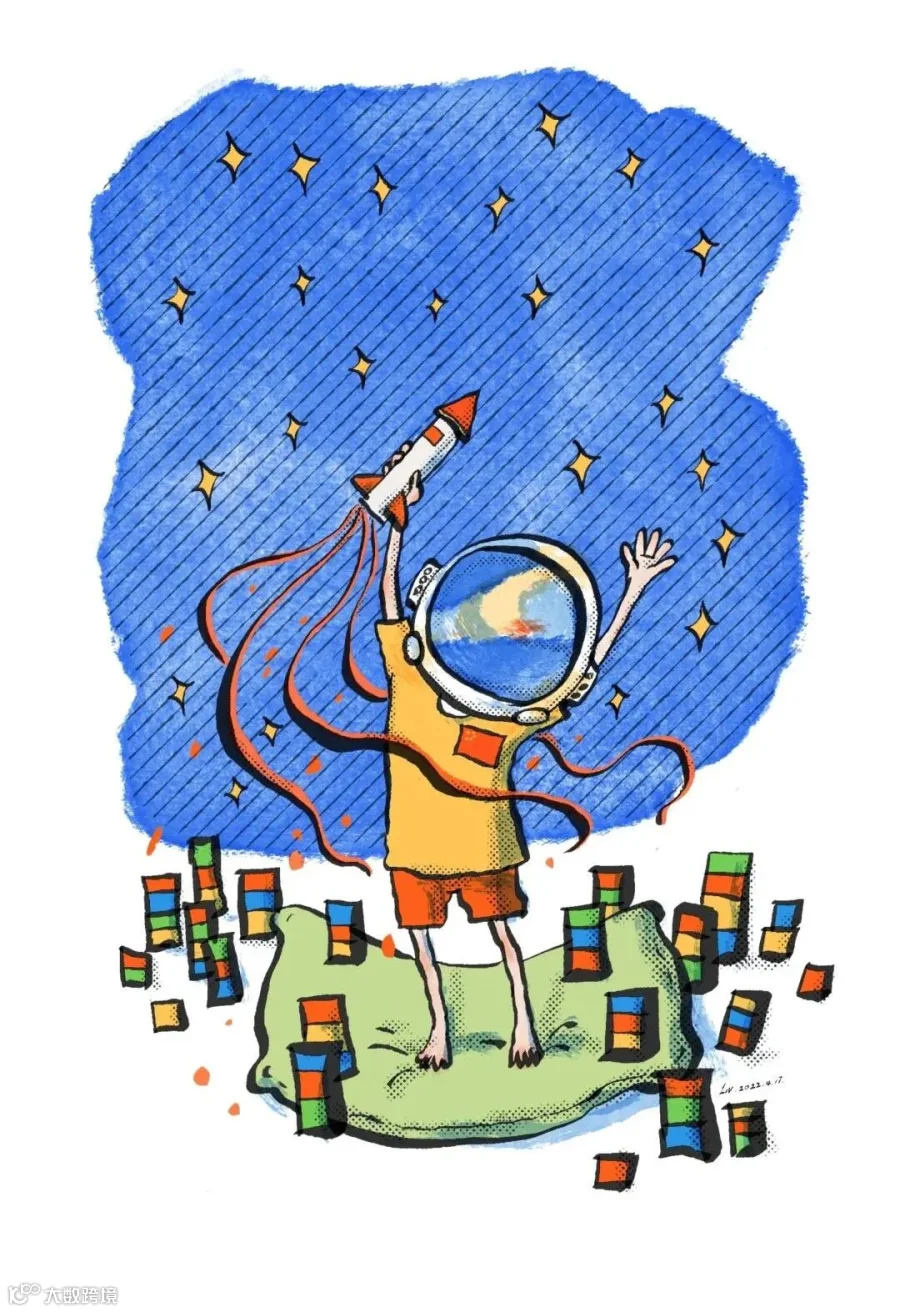 In cartoonist Lin Na's painting, a cute panda with a space dream uses a bubble wand to blow one after another bubble star, dreaming of exploring the vast space, so as to pay tribute to our space explorers.