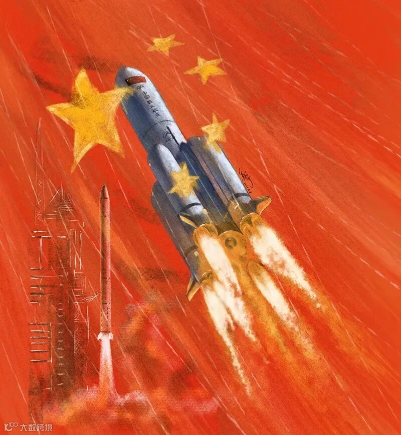In the painting produced by artist Hei Bei (@黑背), the Five-Starred Red Flag is used as the backdrop, on which Long March-5, currently the largest low-Earth orbit carrying capacity among China's rockets, blasts off. The artist desires to show his pride in the country's space industry.