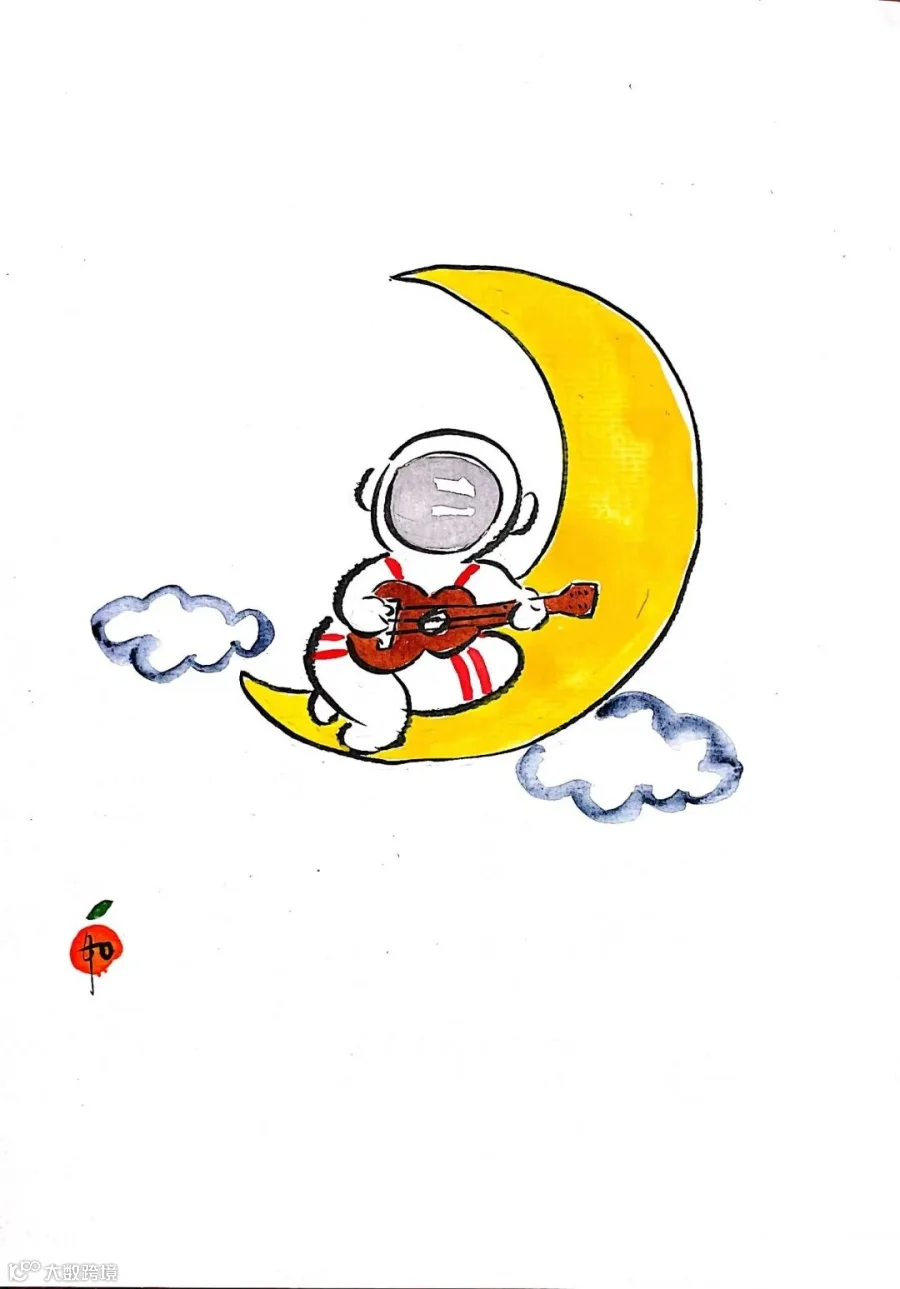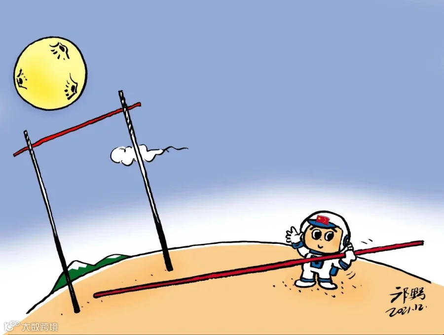 Cartoonist Kuang Ye also applied a light-hearted and humorous way to present two paintings to welcome our space heroes back and wish the country's space industry even more success in the future. In one painting, three astronauts get out of the return capsule of the Shenzhou-13 spaceship on a children's slide, while in the other an astronaut is ready for a jump aiming at the Moon.