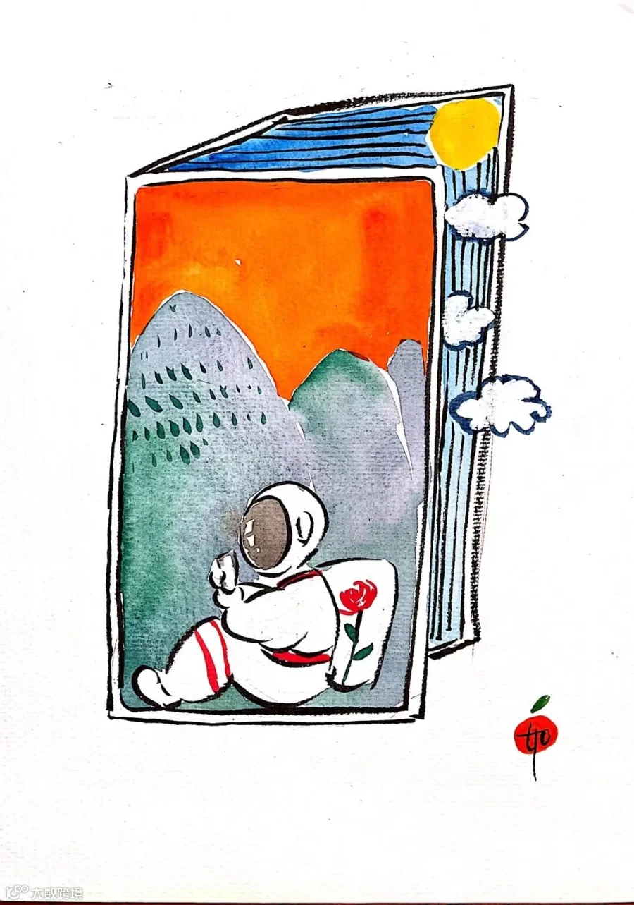 Cartoonist Ru Guoguo (@如果果) presented a set of six paintings, depicting her imagination of a taikonaut's lonely but romantic life in space.