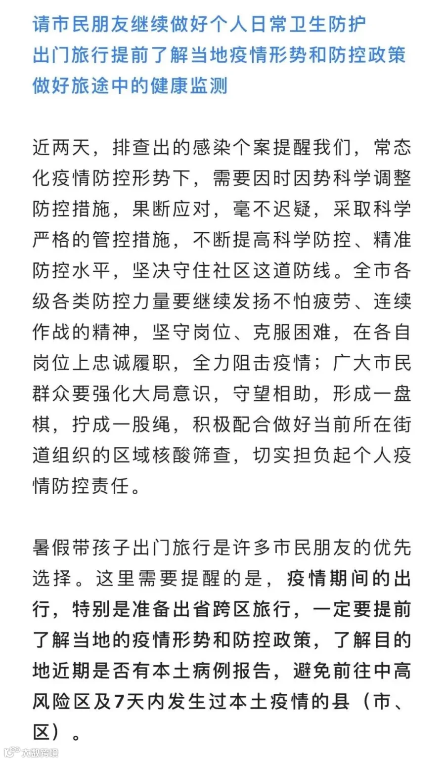 请市民朋友继续做好个人日常卫生防护,规范佩戴符合标准的口罩,继续维持勤洗手、常通风、保持社交距离等良好生活习惯。积极配合各类场所和单位测温、扫(亮)码查验等相关防控要求。同时,密切关注居住地、单位等疫情防控相关通知信息,做好个人防护,按时有序积极参加核酸筛查。