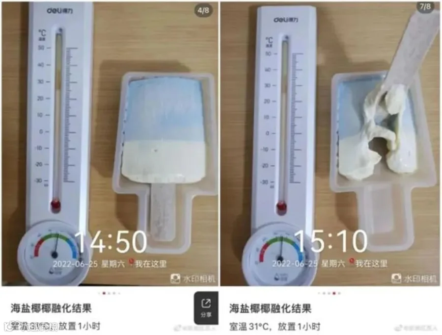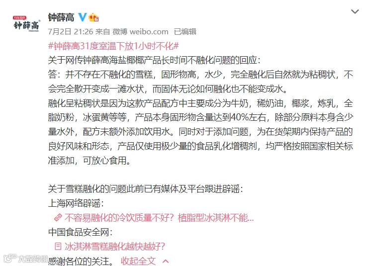 7月2日晚,@钟薛高就此事发布官方声明称,“关于网传钟薛高海盐椰椰产品长时间不融化的问题,并不存在不融化的雪糕。融化呈粘稠状是因为这款产品配方中主要成分为牛奶、稀奶油、椰浆、炼乳、全脂奶粉、冰蛋黄等,产品本身固形物含量达到40%左右,除部分原料本身含少量水外,配方未额外添加饮用水。”