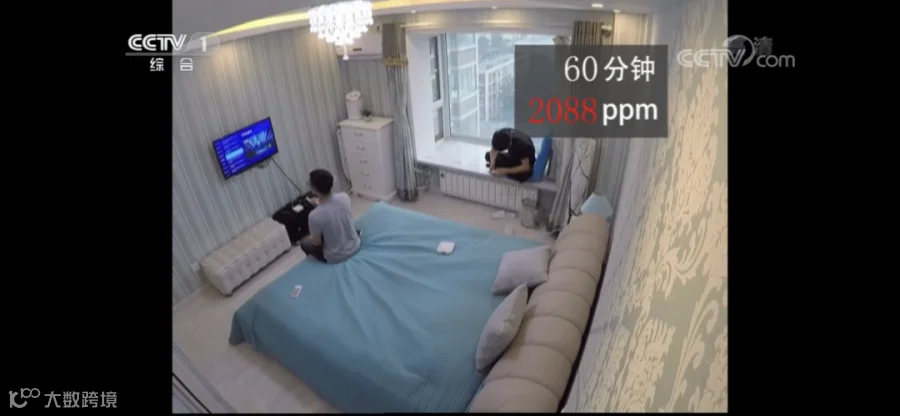 房间在开空调前,二氧化碳浓度为472ppm,空气清新。实验区域在密闭开启空调一个小时后,二氧化碳浓度爬升至2088ppm,比室内二氧化碳标准值高出1088ppm。