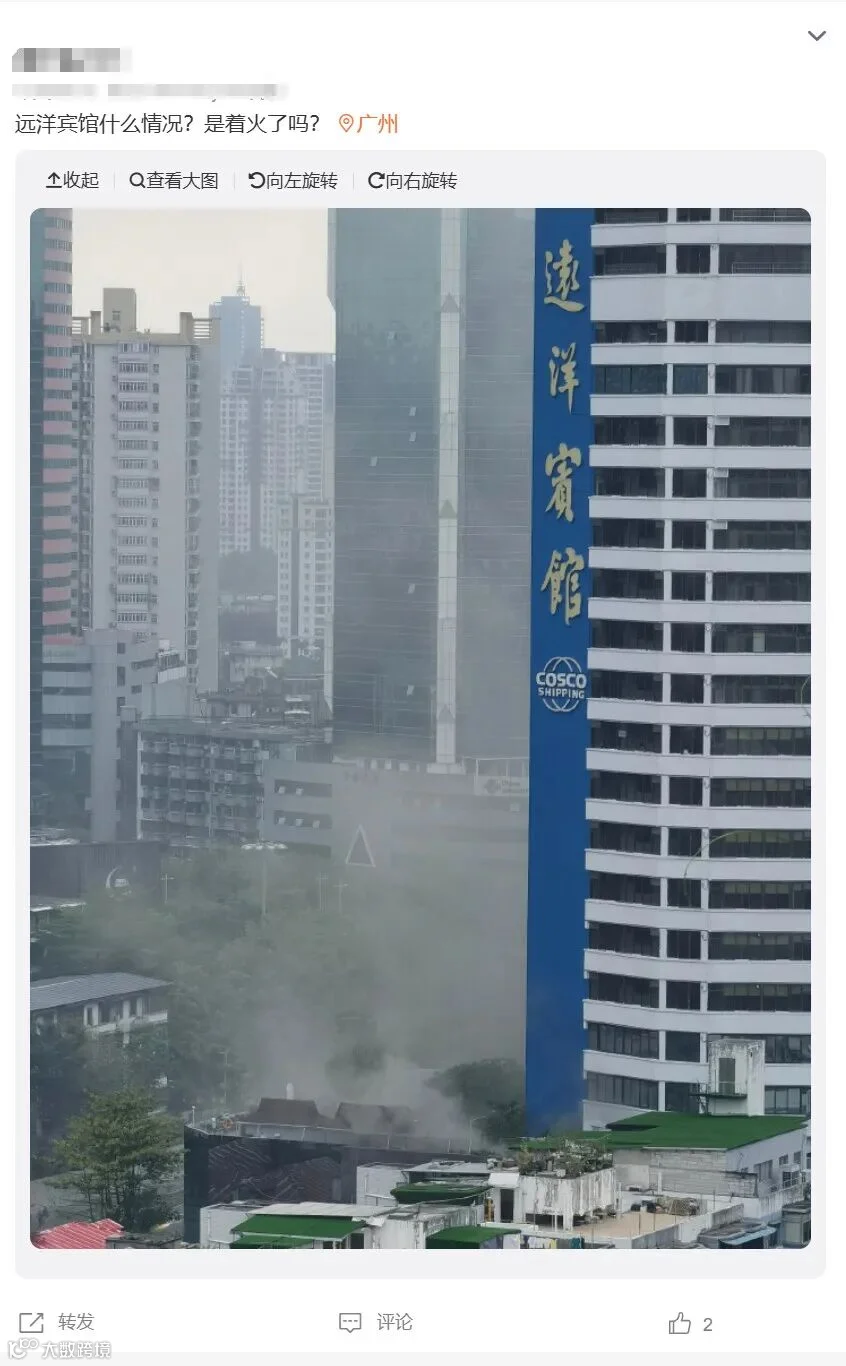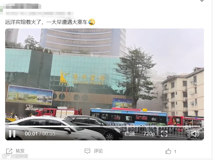 4月23日上午,有网民发文称远洋宾馆发生火灾。图片来源:网络。
