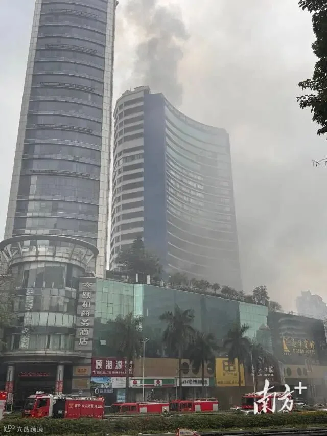 4月23日上午,位于广州市越秀区环市东路的远洋宾馆大楼发生火灾,现场有浓烟冒出,环市东路堵塞严重。