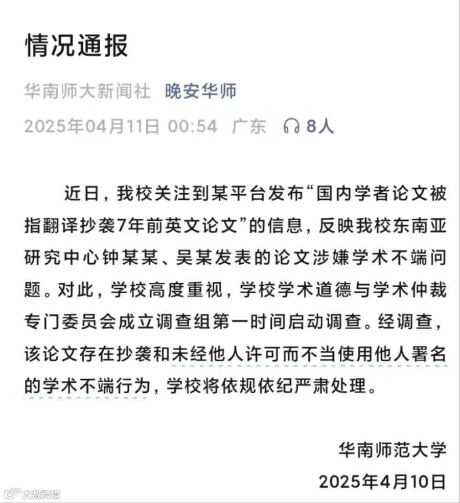 华南师范大学通报:钟某某、吴某论文存在学术不端行为