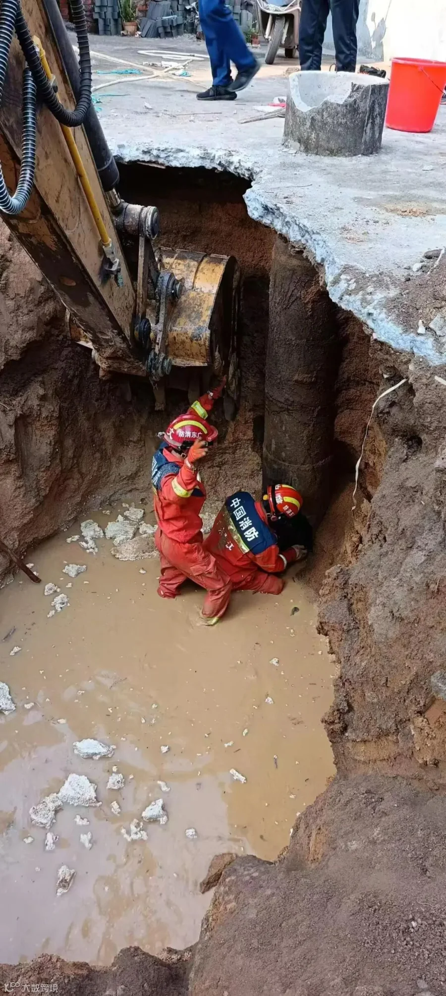 救援人员决定先采取救援三脚架进行吊升救援,系统搭建完成后,救援人员挑选身材偏瘦者下井作业。由于井口直径过小,救援人员下去后没有空间进行作业,于是立即采用第二方案,调派挖掘机过来把井道旁50厘米处的泥土挖空。
