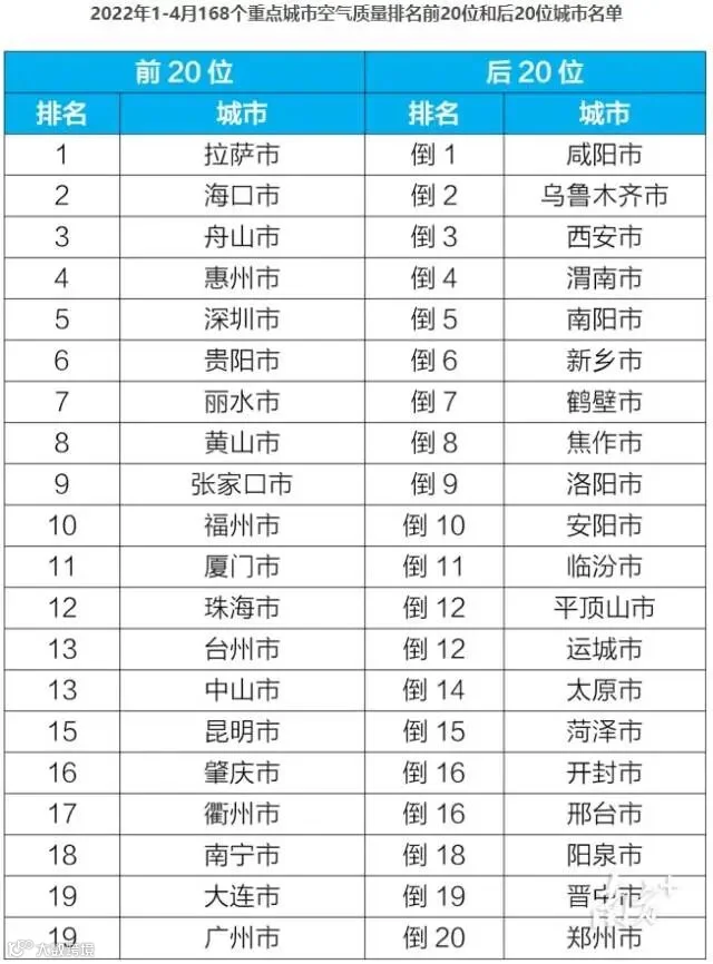 近日,生态环境部通报了今年4月和1—4月全国环境空气质量状况。其中,惠州、深圳、珠海、中山、肇庆、广州位列1—4月168个重点城市中的前20名。