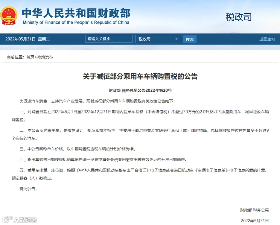 今天,南方君从中华人民共和国财务部官方网站获悉,为促进汽车消费,支持汽车产业发展,财政部、税务总局5月31日联合发布《关于减征部分乘用车车辆购置税的公告》,公告如下: