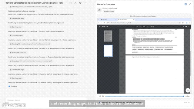 演示一开始就放了个大招,官方向Manus发送了一个包含10份简历的压缩文件,Manus像一个专业招聘人员一样,先解压文件,然后逐页浏览每份简历,并记录重要信息。Manus还能异步处理文件,这意味着你可以随时关闭电脑,等任务完成后,它会通知你。在这个过程中,你也可以随时给它新的指令。