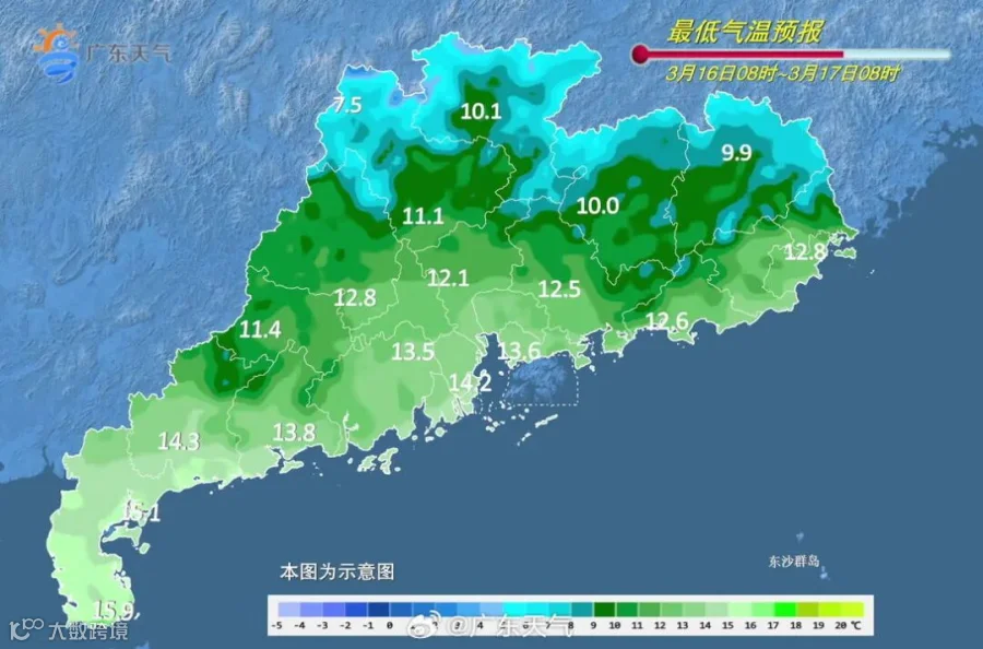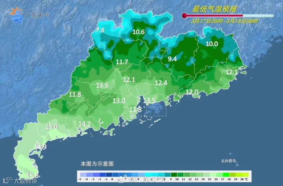 17日,广东多云。早晨最低气温:粤北和粤东市县8~11℃,雷州半岛16~19℃,其余市县12~15℃。