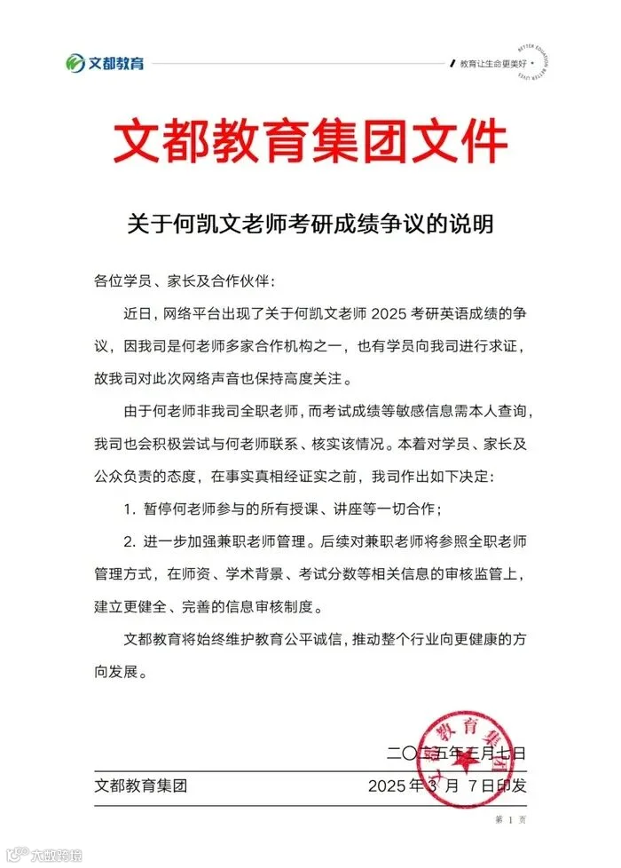3月7日,何凯文合作机构之一文都教育集团发布说明称,