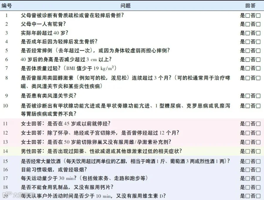 2017年中国的一份指南推荐了国际骨质疏松基金会(IOF)骨质疏松症风险一分钟测试题,我们可以根据量表先自测,如果发现有问题,再去医院做进一步检查。