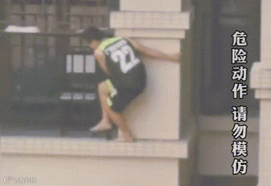 沿着阳台护栏边缘爬到幼童附近