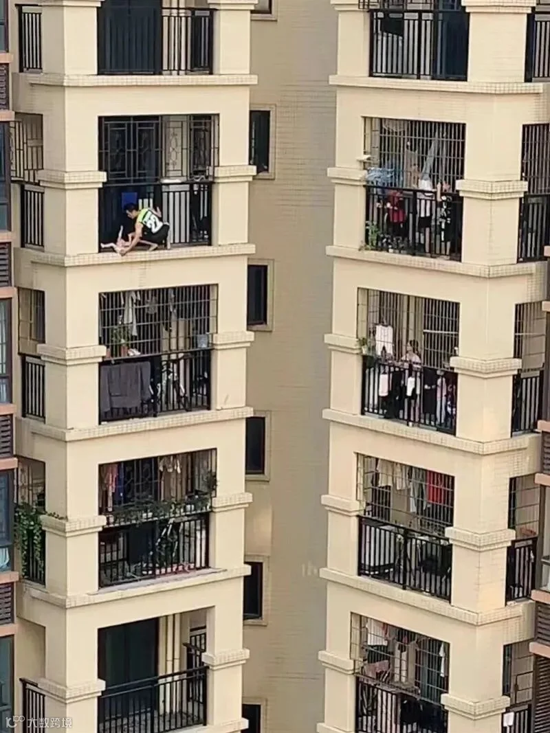 看到一名小孩悬挂在8楼的阳台外