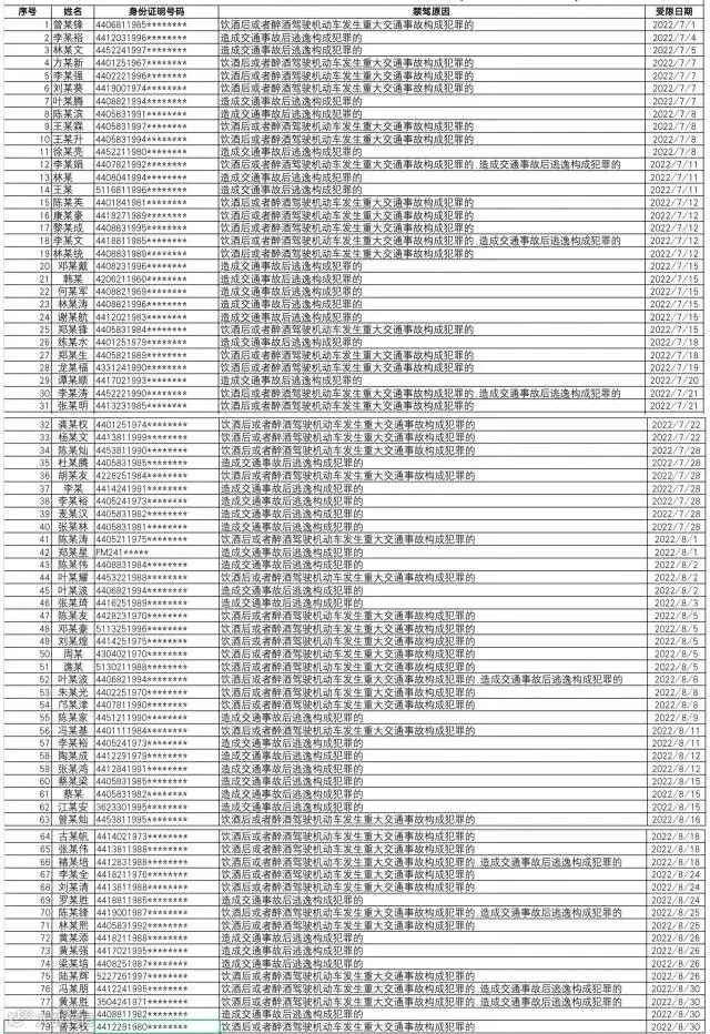 中秋假期已至尾声,9月12日,记者从广东省公安厅交通管理局获悉,广东省道安办曝光“百日行动”以来的一批高风险运输企业、突出违法车辆、事故多发路段,并公布了新增的79名终生禁驾人员名单。