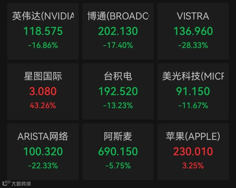 因受到DeepSeek人工智能模型冲击,美国芯片巨头英伟达(NVIDIA)当日股价暴跌约17%,博通公司股价下跌17%,超威半导体公司(AMD)股价下跌6%,微软股价下跌2%。此外,人工智能领域的衍生品,如电力供应商也受到重创。美国联合能源公司股价下跌21%,Vistra的股价下跌28.33%。