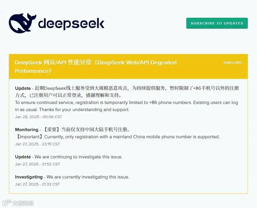 1月28日,DeepSeek官网的服务状态页面显示:近期DeepSeek线上服务受到大规模恶意攻击,为持续提供服务,暂时限制了+86手机号以外的注册方式,已注册用户可以正常登录,感谢理解和支持。